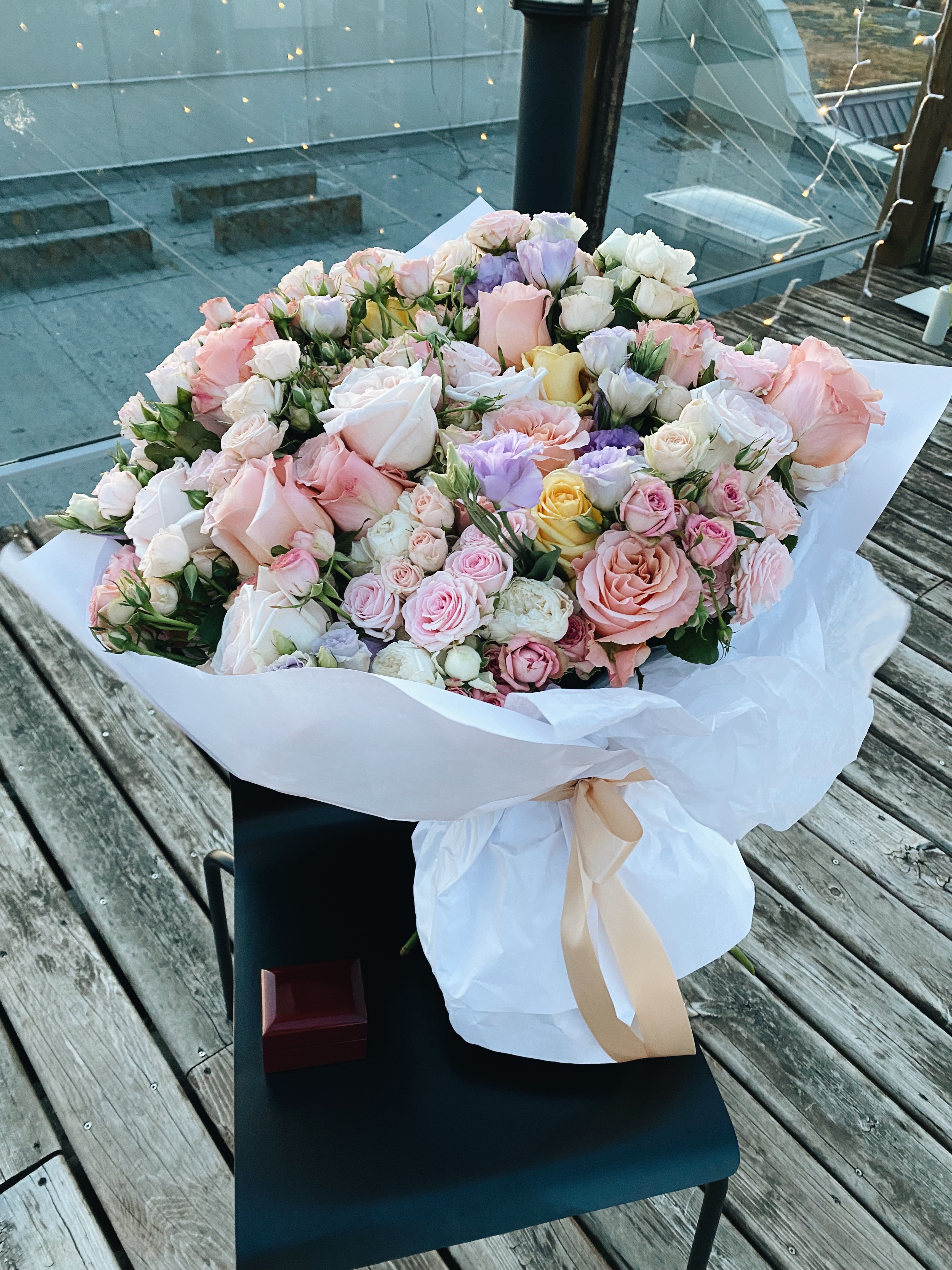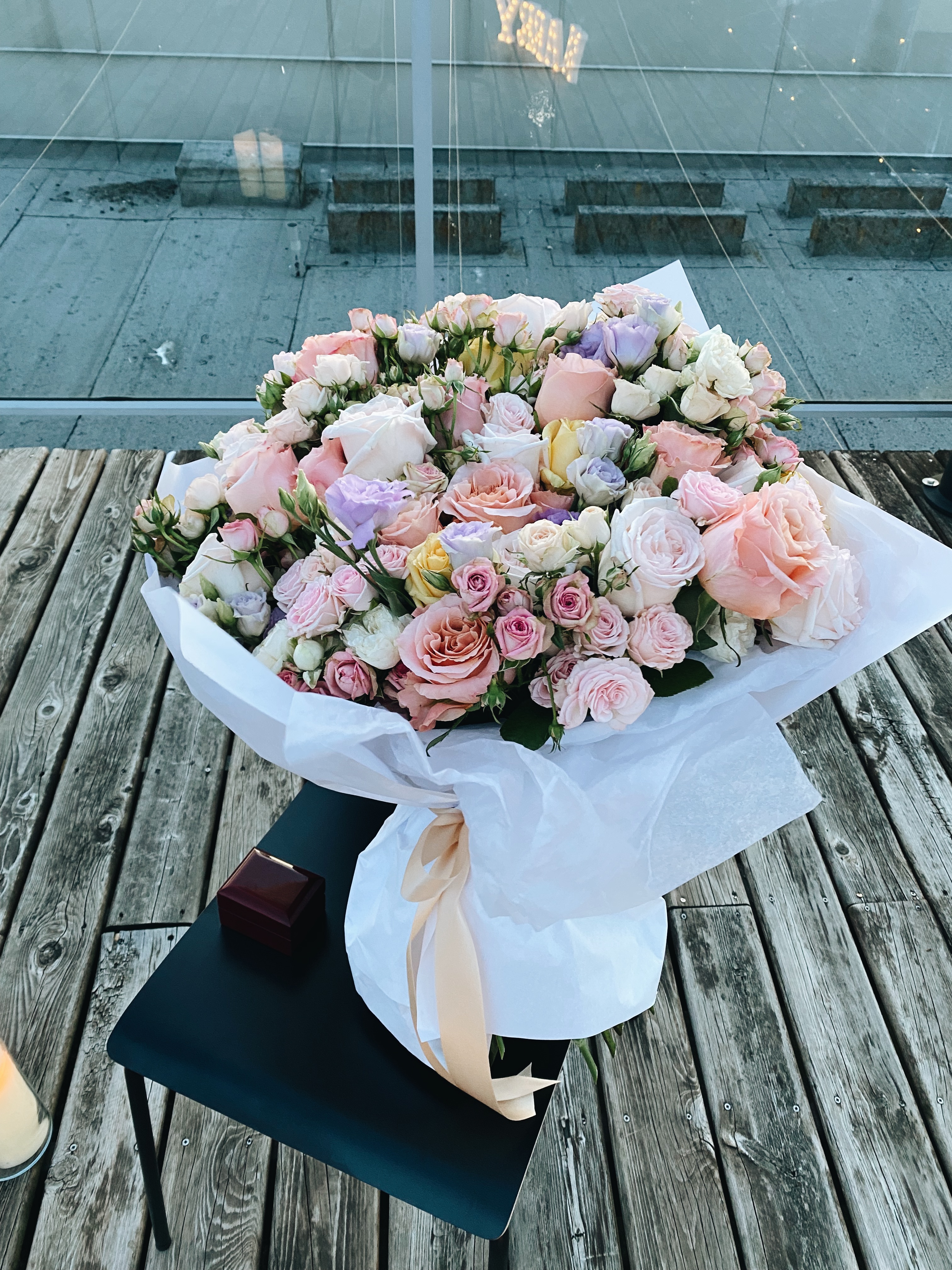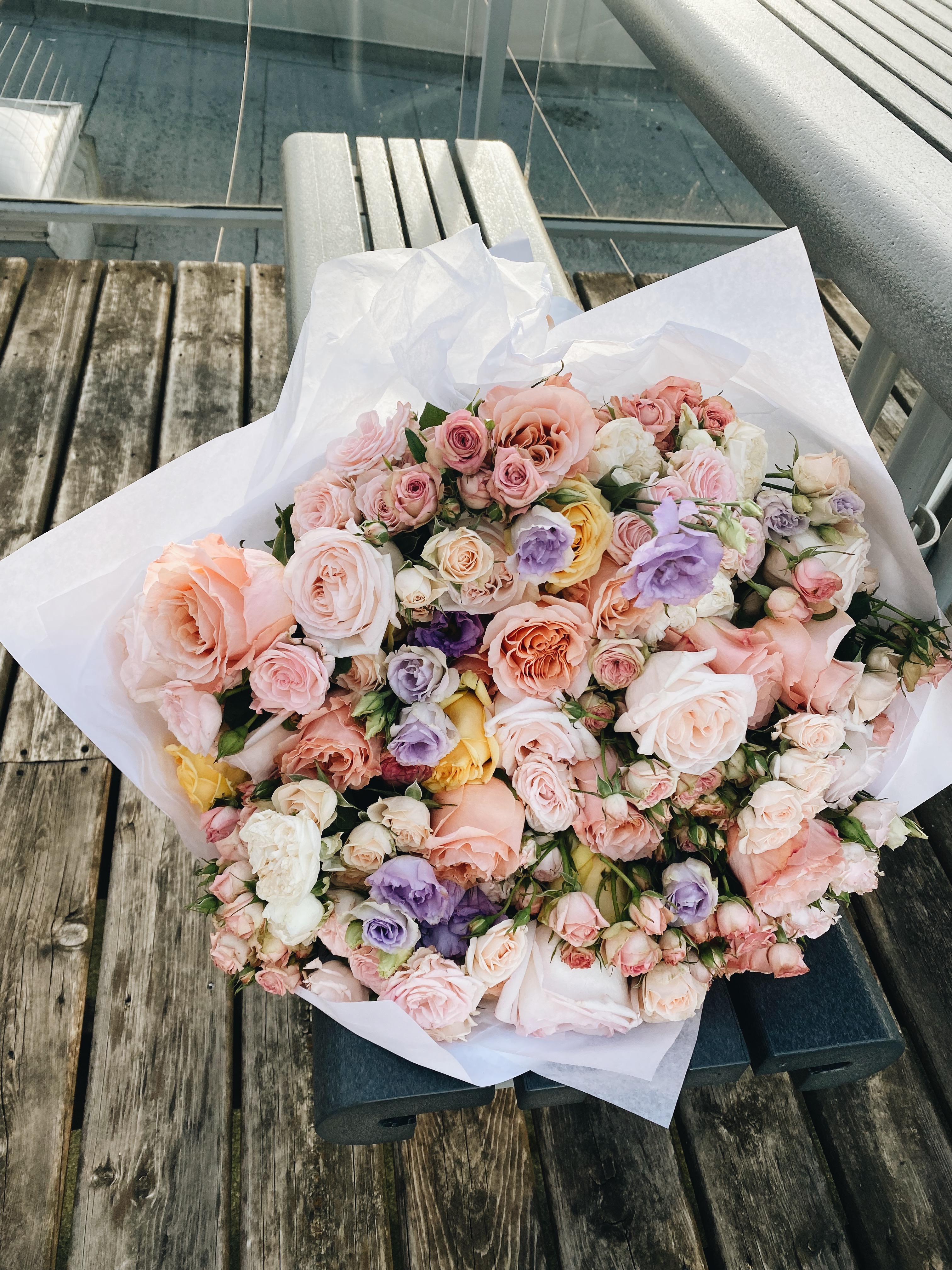 메인 꽃다발, 여러 색을 표현하고 싶었는데 가든장미, 일반 장미, 스프레이 로즈, 리시안셔스 등 꽤 많이 들어갔다.