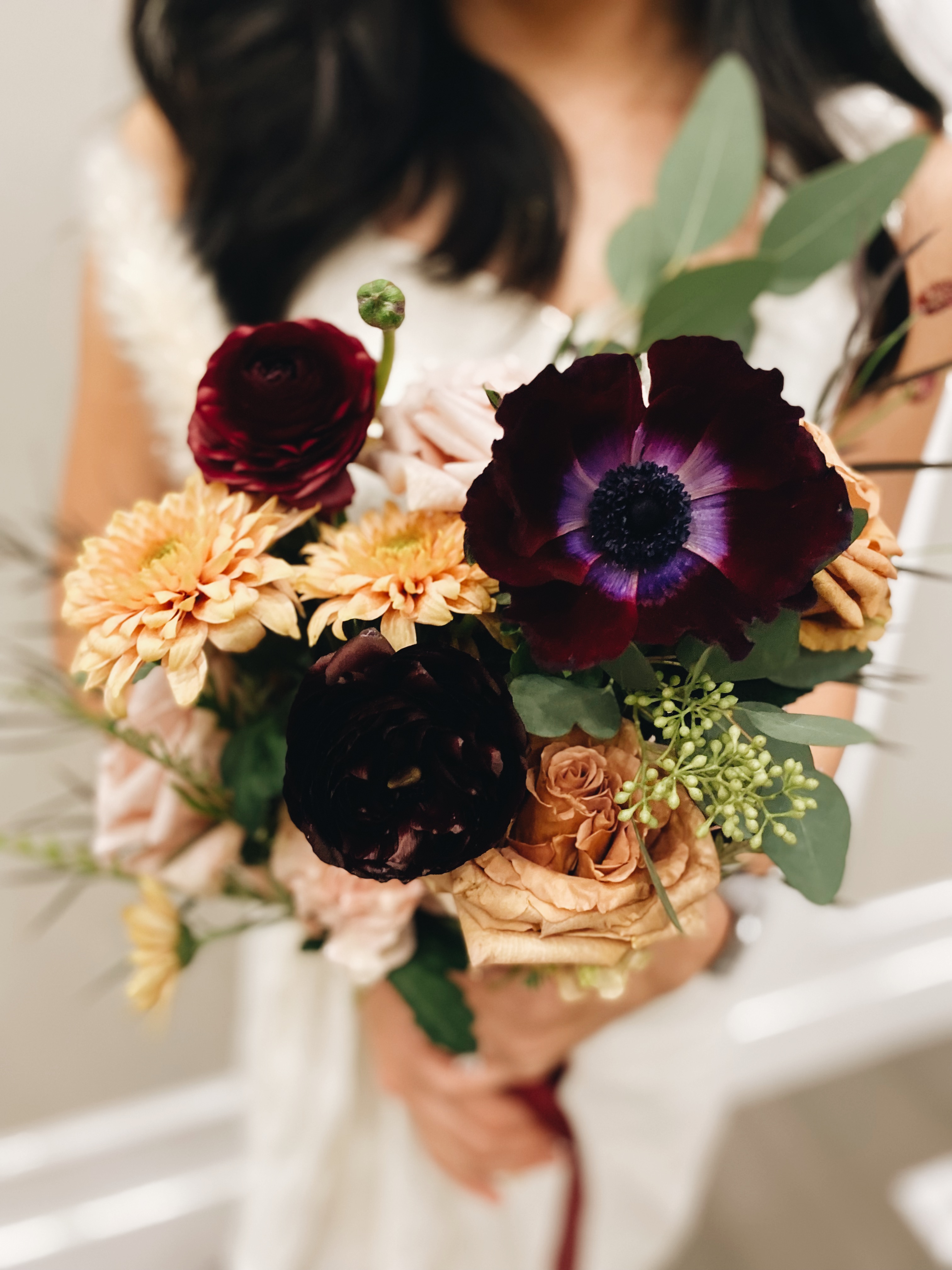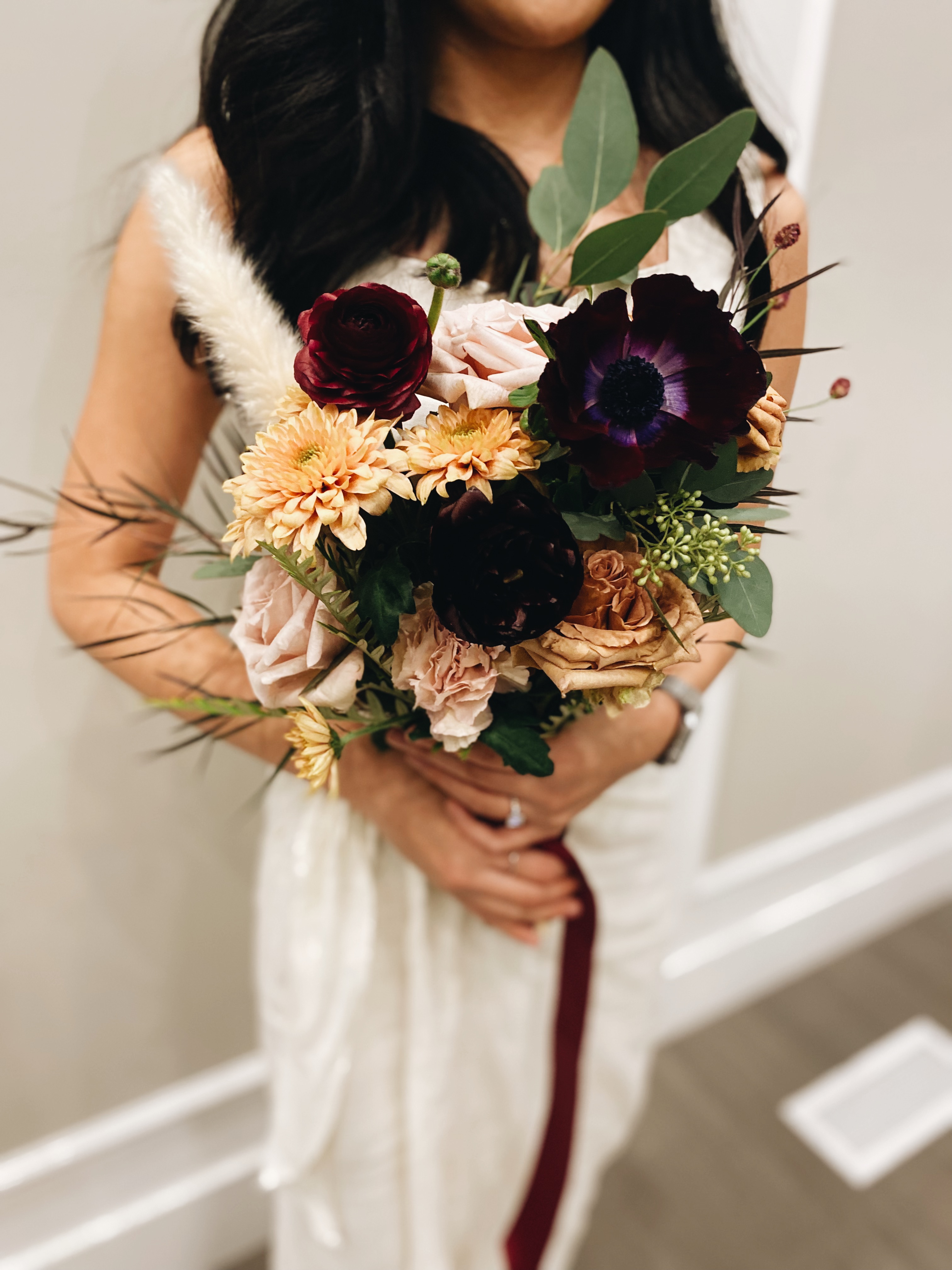 아네모네, 스프레이멈, 퀵샌드장미, 카네이션, 토피 로즈, 팜파스 그라스, 라넌큘러스가 들어갔어요.